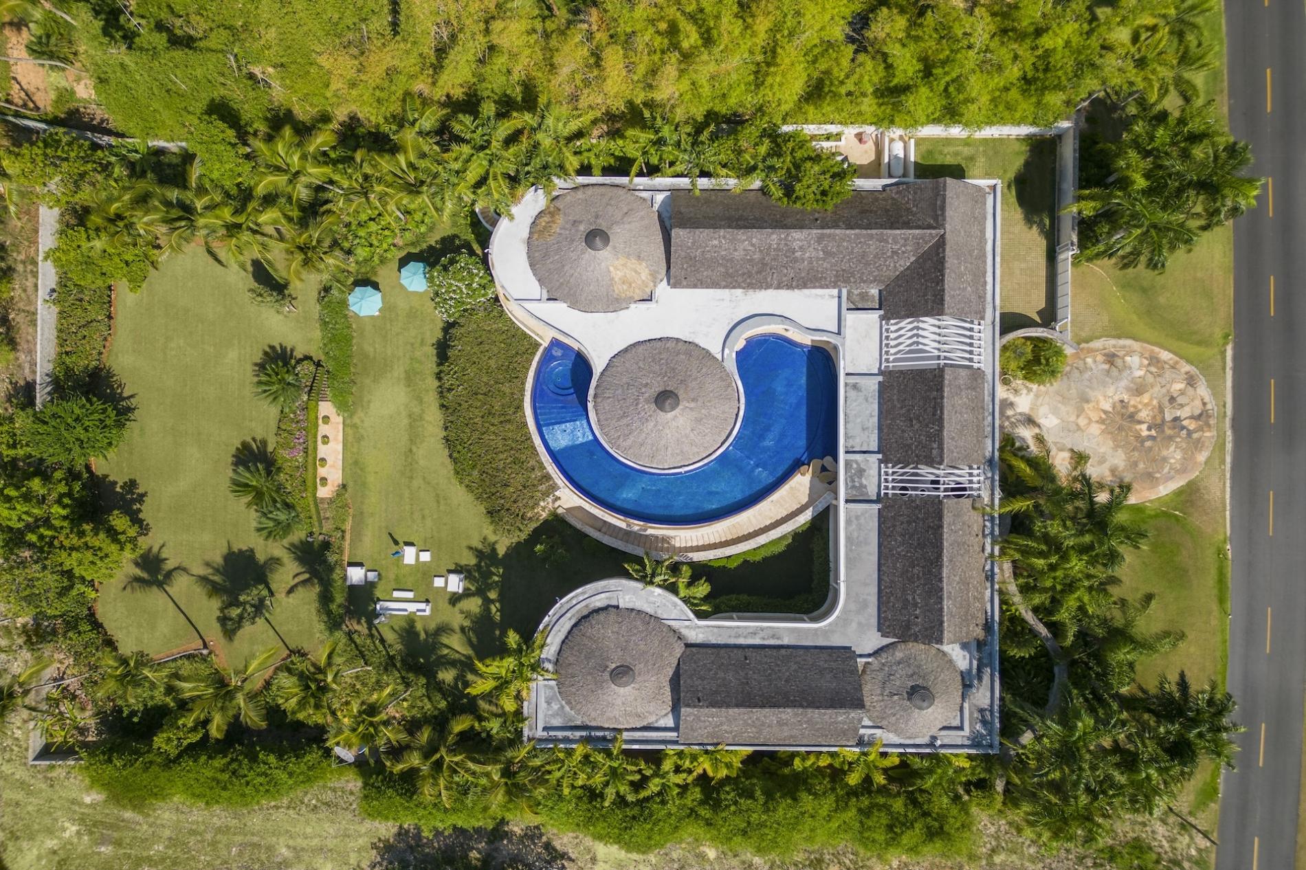 From above, the villa’s thoughtful design reveals itself — a symbolic yin-yang created by palapa-covered pavilions and a sweeping, curved infinity pool, representing elegance, flow, and peace. Indoor and outdoor living merge effortlessly, with breezy, open-concept spaces framed by lush greenery and soft, filtered light.