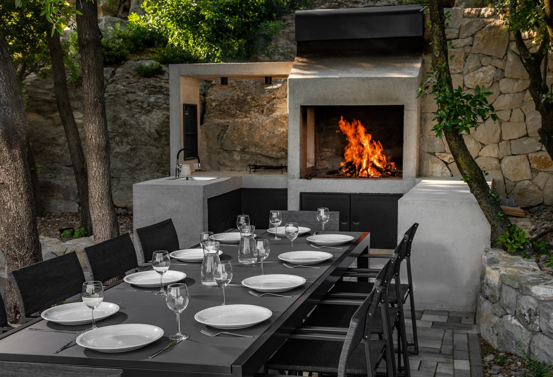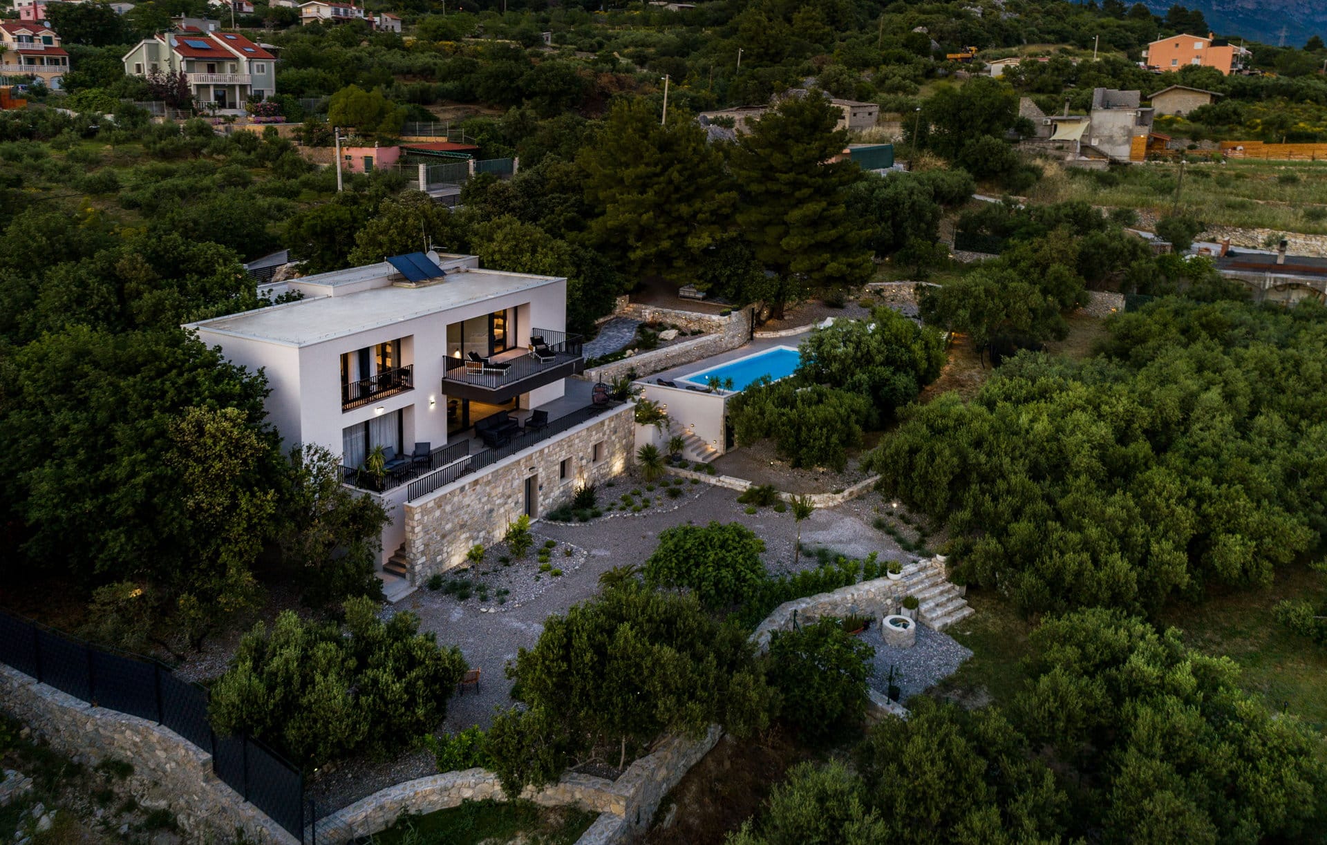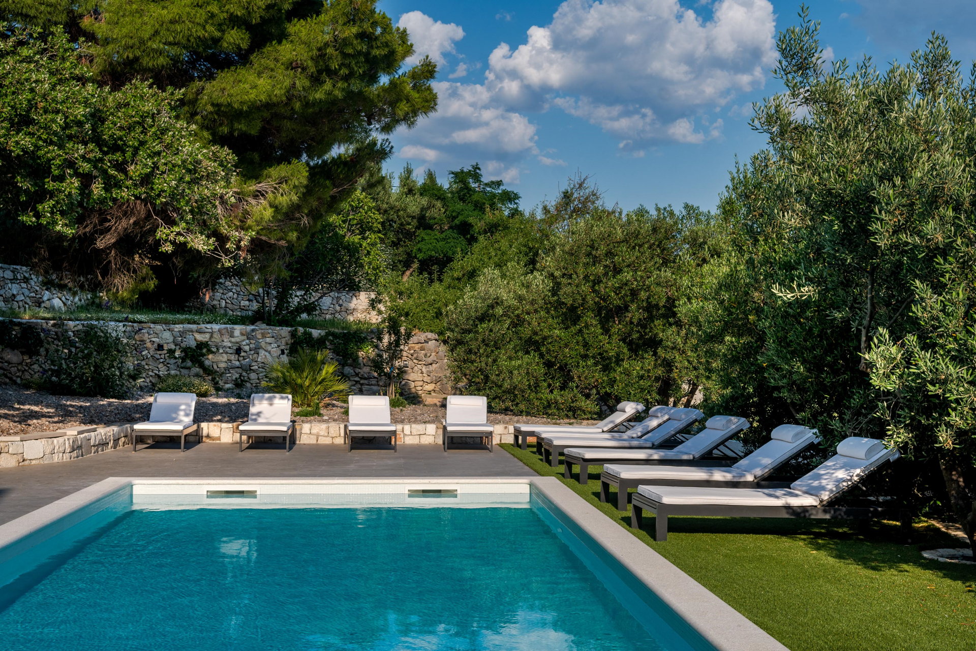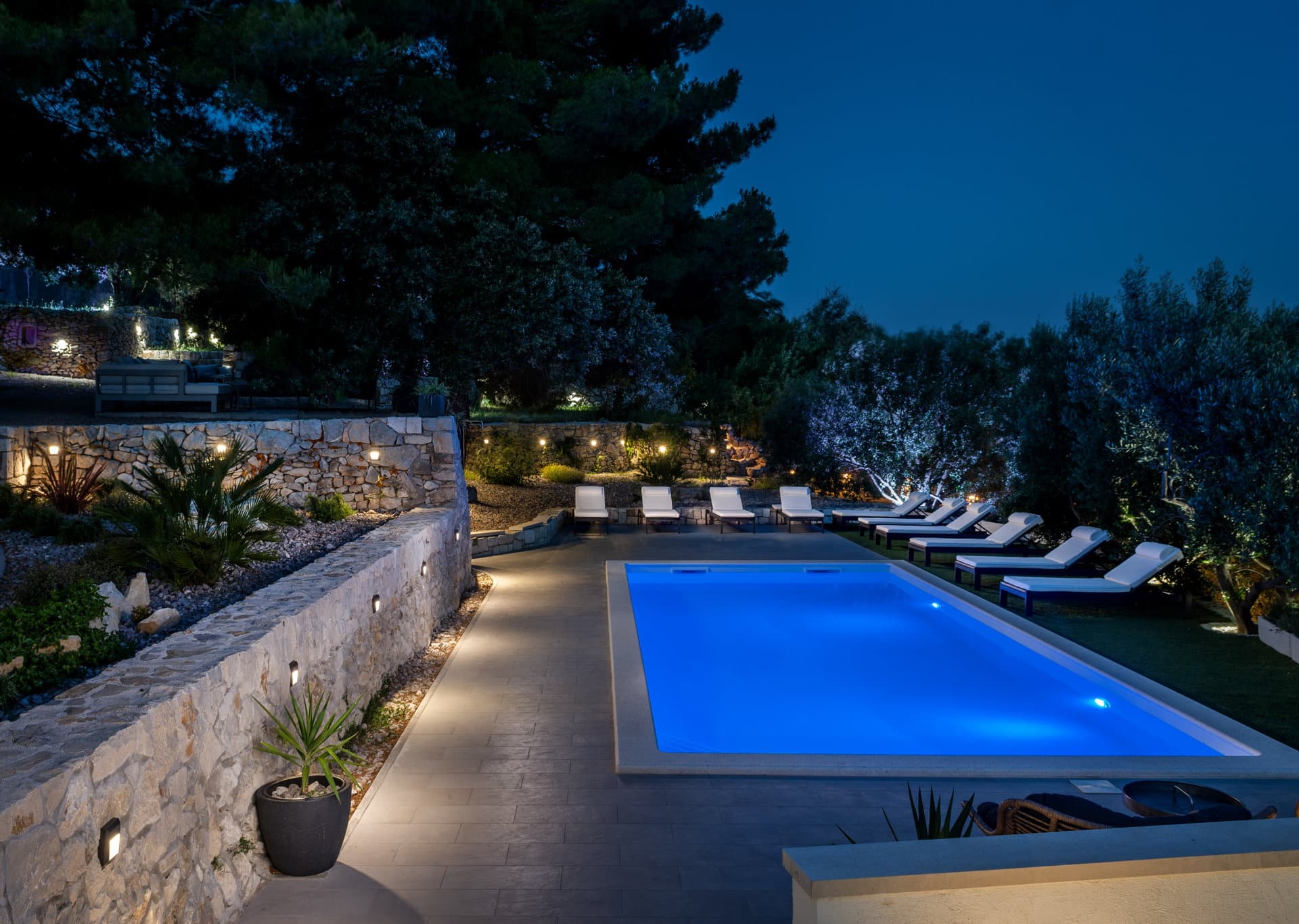 An inviting pool is surrounded by beach chairs where you can relax and soak up the hot dalmatian sun. On the upper level of the yard, there is a big lounge area hidden in the pine tree shadows. On the lower level of the yard, you can find a playground for children.