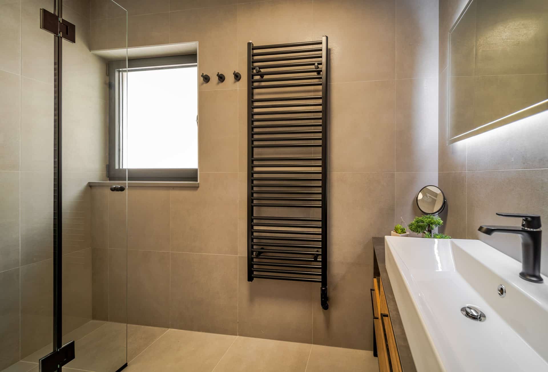 This modern Split villa features three floors. On the middle level, there is an open-concept living and dining area. Black and brown tones dominate the space and are complemented with wooden details. Everywhere around you, there are large windows that provide an unobstructed view of the outdoor area as well as an amazing sea view. Being so close to nature is so calming and restful. A fully-equipped kitchen has a big kitchen island and direct access to the terrace. One bedroom and a bathroom are also on this floor.