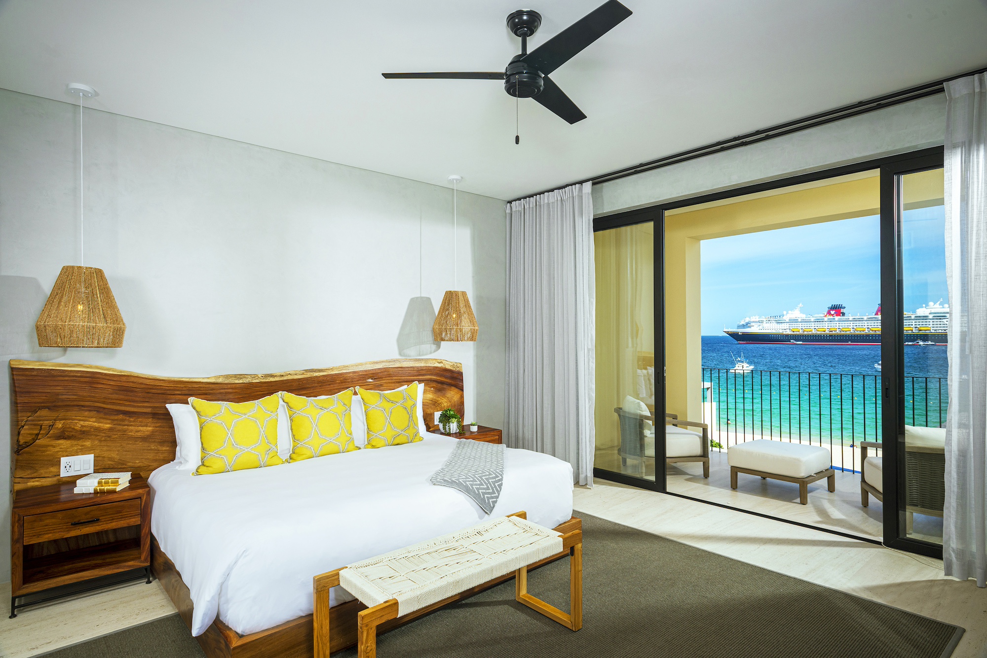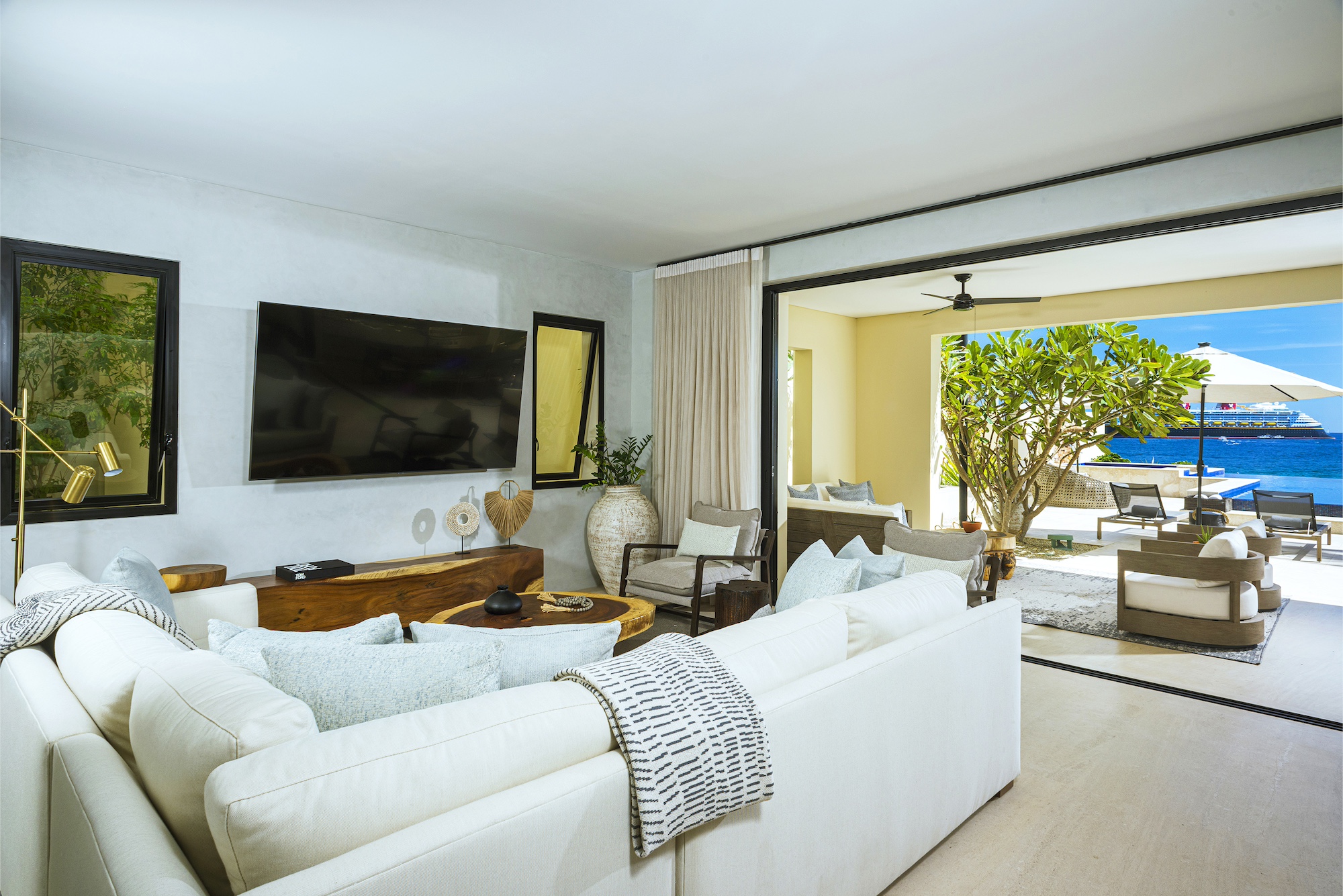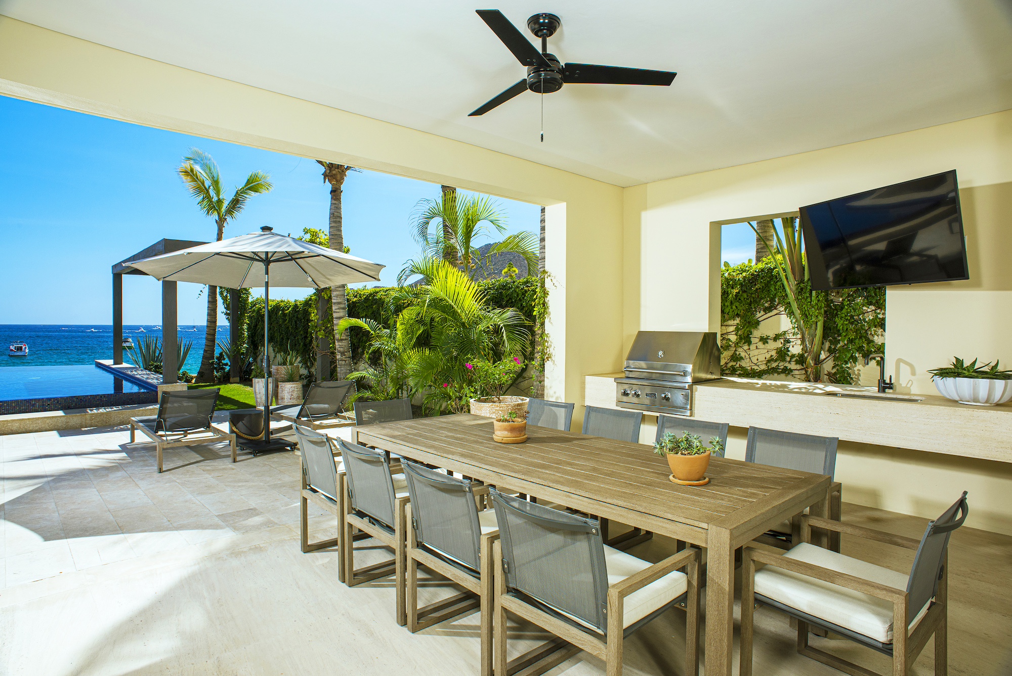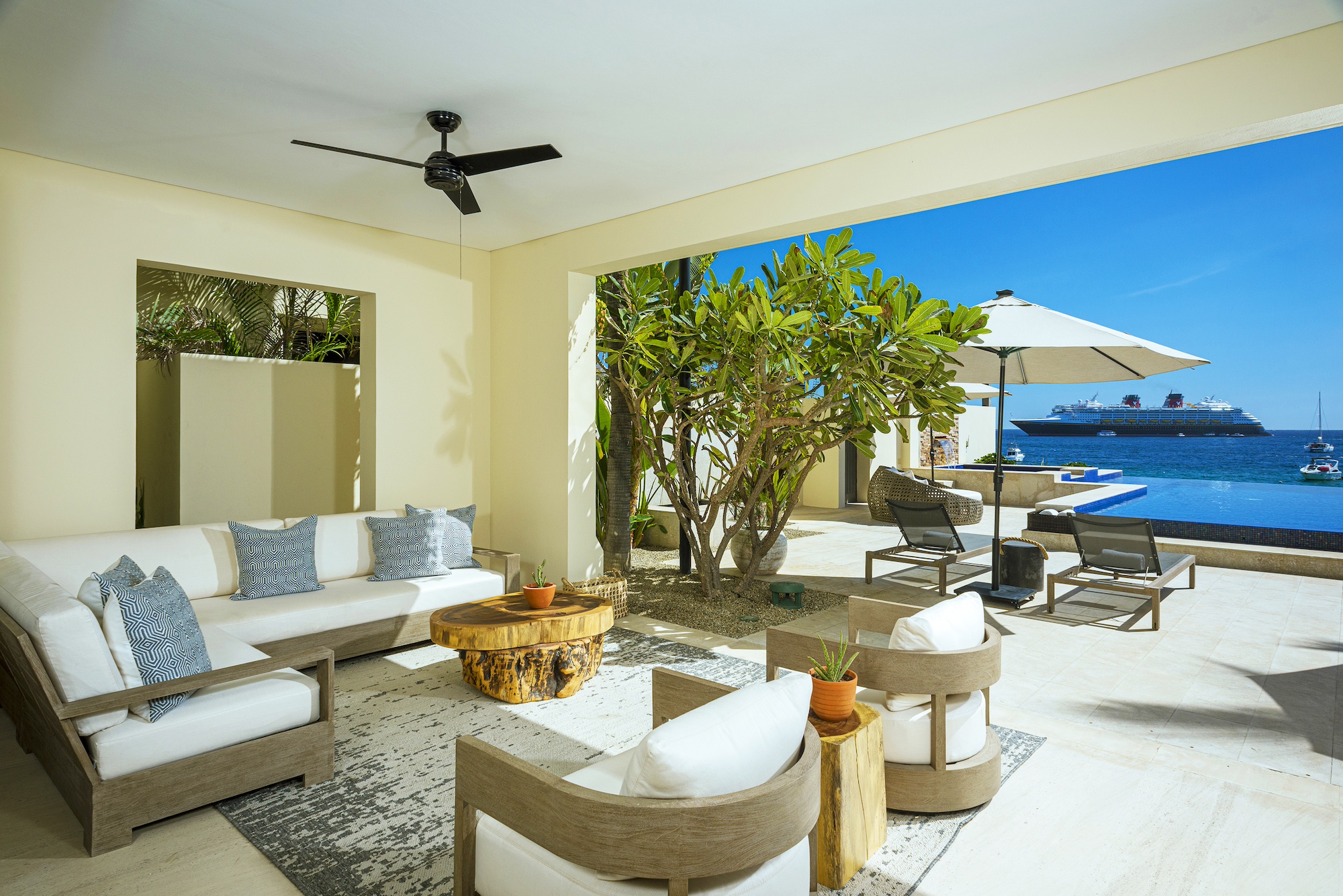 Upon arrival, you’ll step into an elegant and warmly adorned haven that exudes luxury and comfort. The chic modern decor, a breathtaking ocean-view terrace with a pool, and a private path leading directly to the sandy shores of Médano Beach are just a few of the many highlights of this magnificent property. The spacious main living area flows seamlessly onto the outdoor terrace through retractable doors, creating the perfect setting for indoor-outdoor living. Enjoy dining on the patio to the soothing sound of the ocean or unwind in your private jacuzzi as you take in the views of Cabo San Lucas Bay.