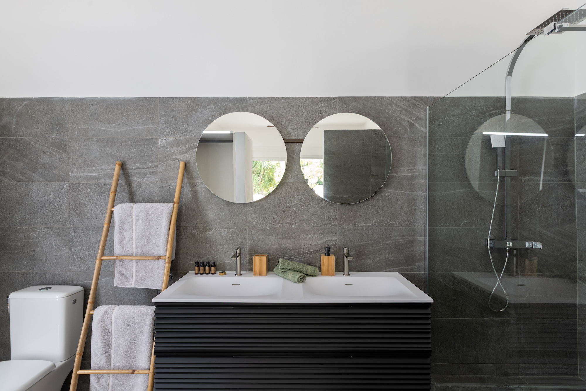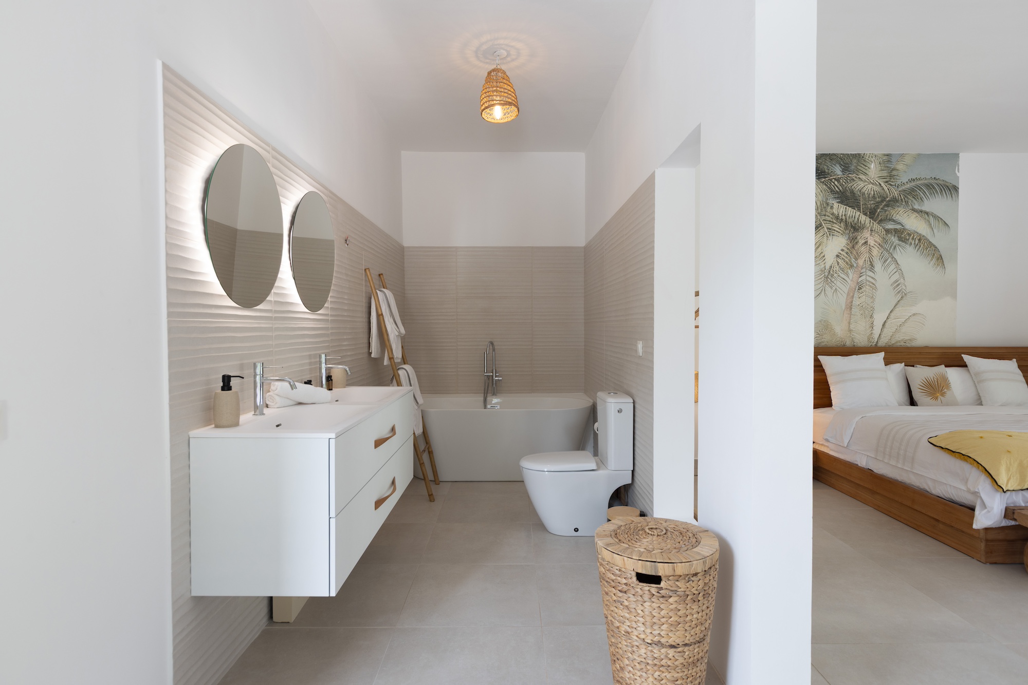 Each of the six bedrooms features an ensuite bathroom, ensuring total comfort and privacy for every guest. The master suite opens directly onto the terrace, offering serene views of the pool and a private garden patio with two loungers, an outdoor shower, and direct access to the jacuzzi—perfect for unwinding at the end of the day.