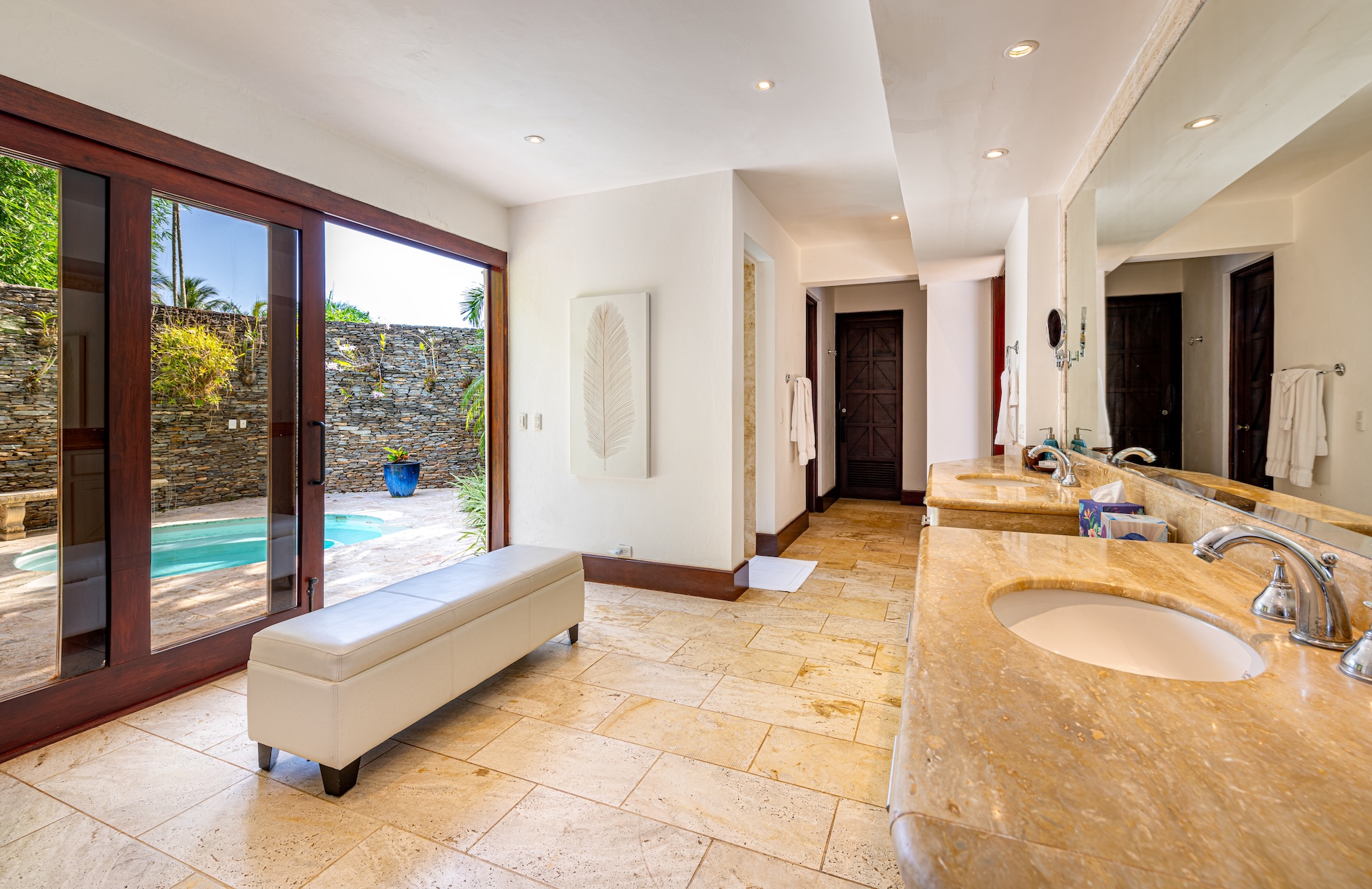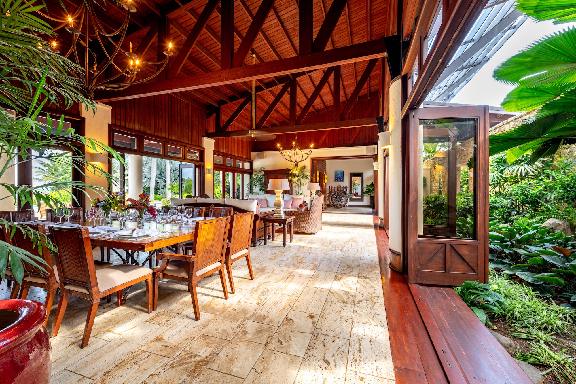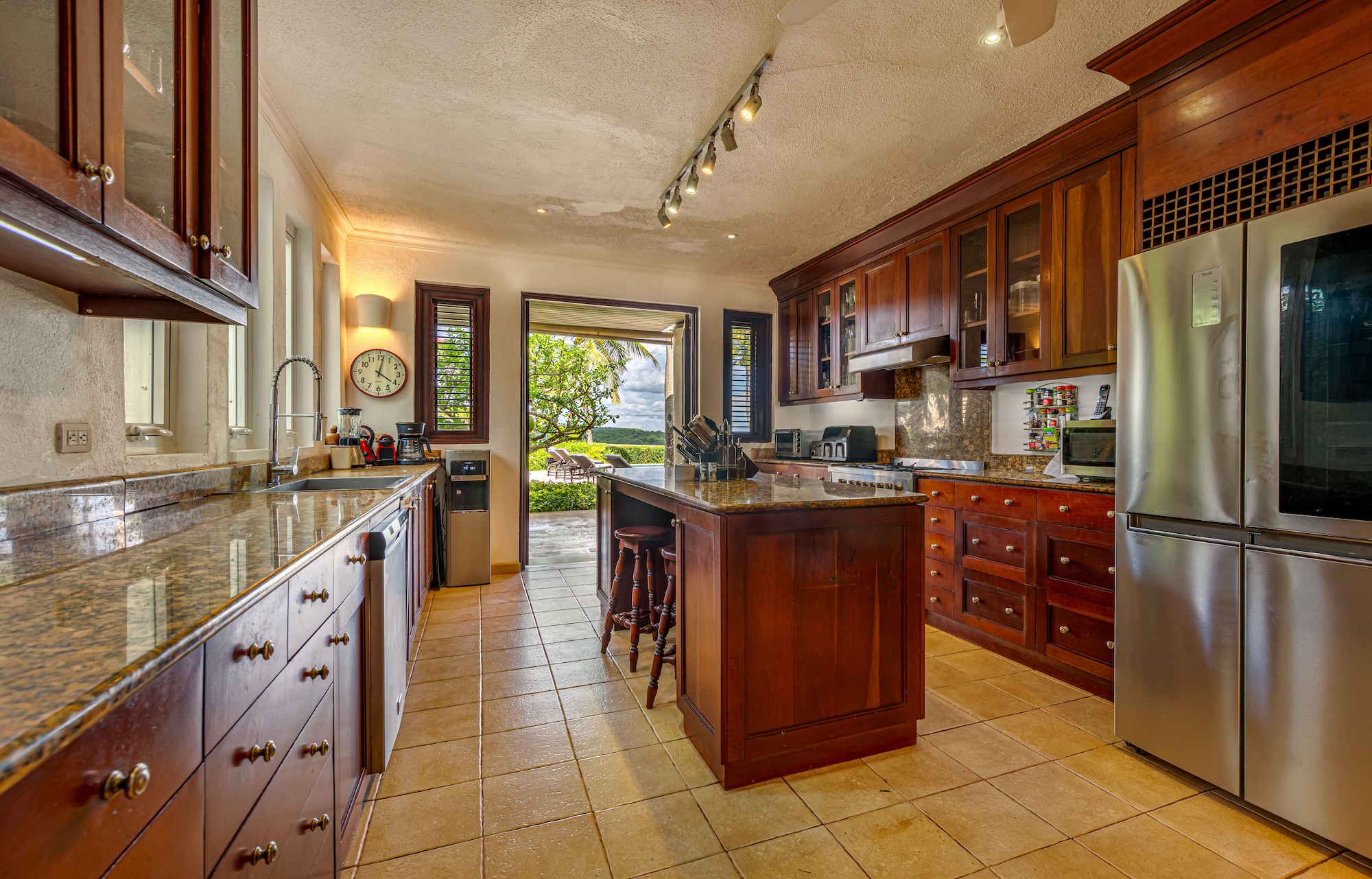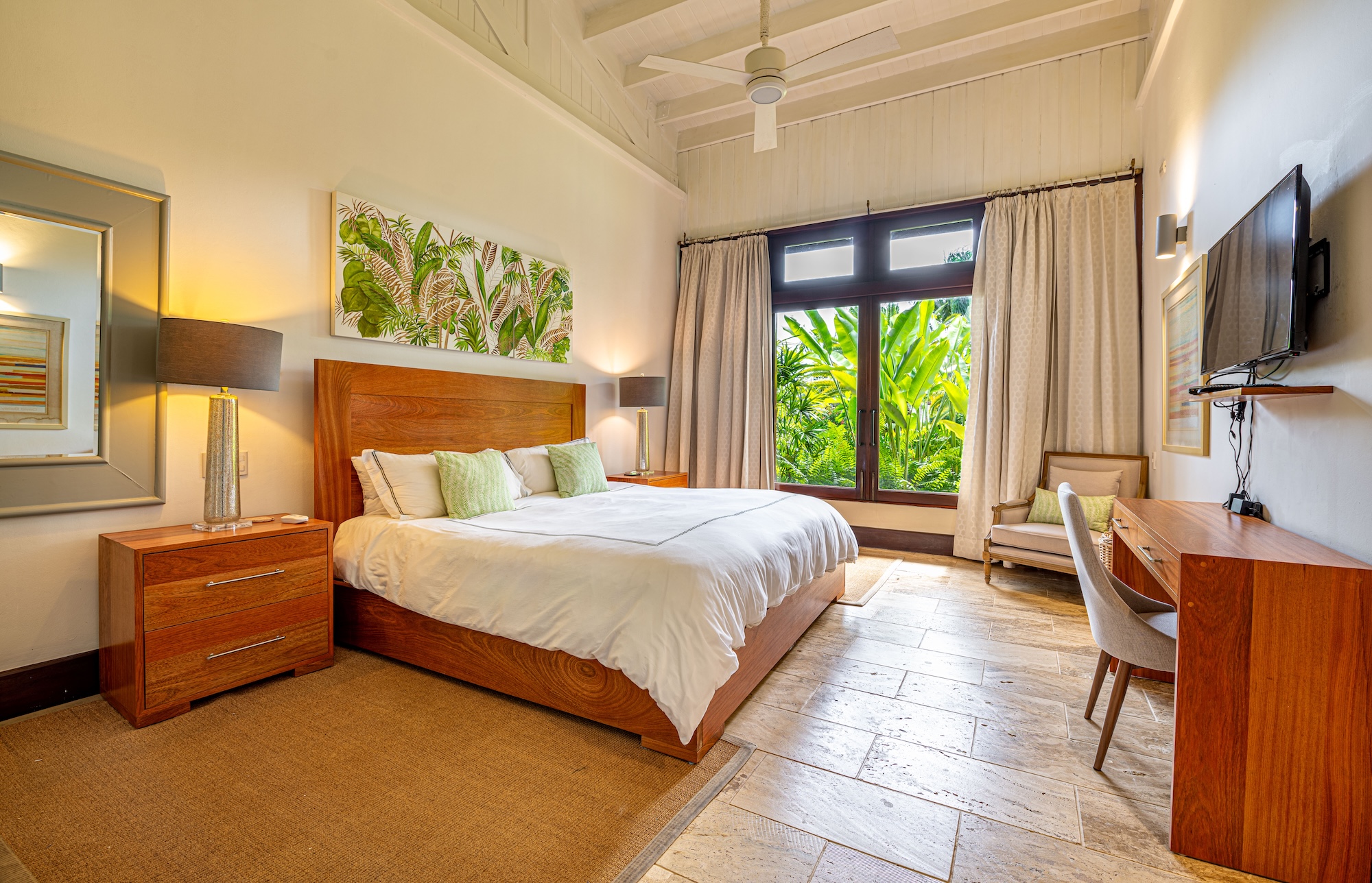 Three of the four bedrooms are situated along a gallery for added privacy, each with its own en suite bathroom. A cozy study/TV room includes a pull-out sofa bed for additional guests. The master suite, located on the opposite side of the house, enjoys gentle easterly breezes. Its spacious bathroom features separate his-and-hers areas and a private outdoor jacuzzi.