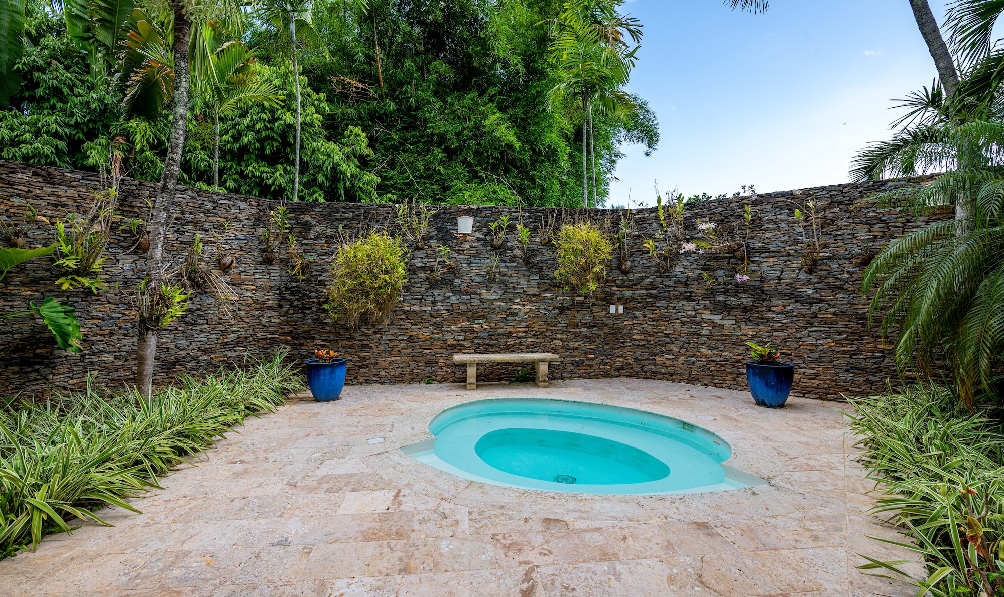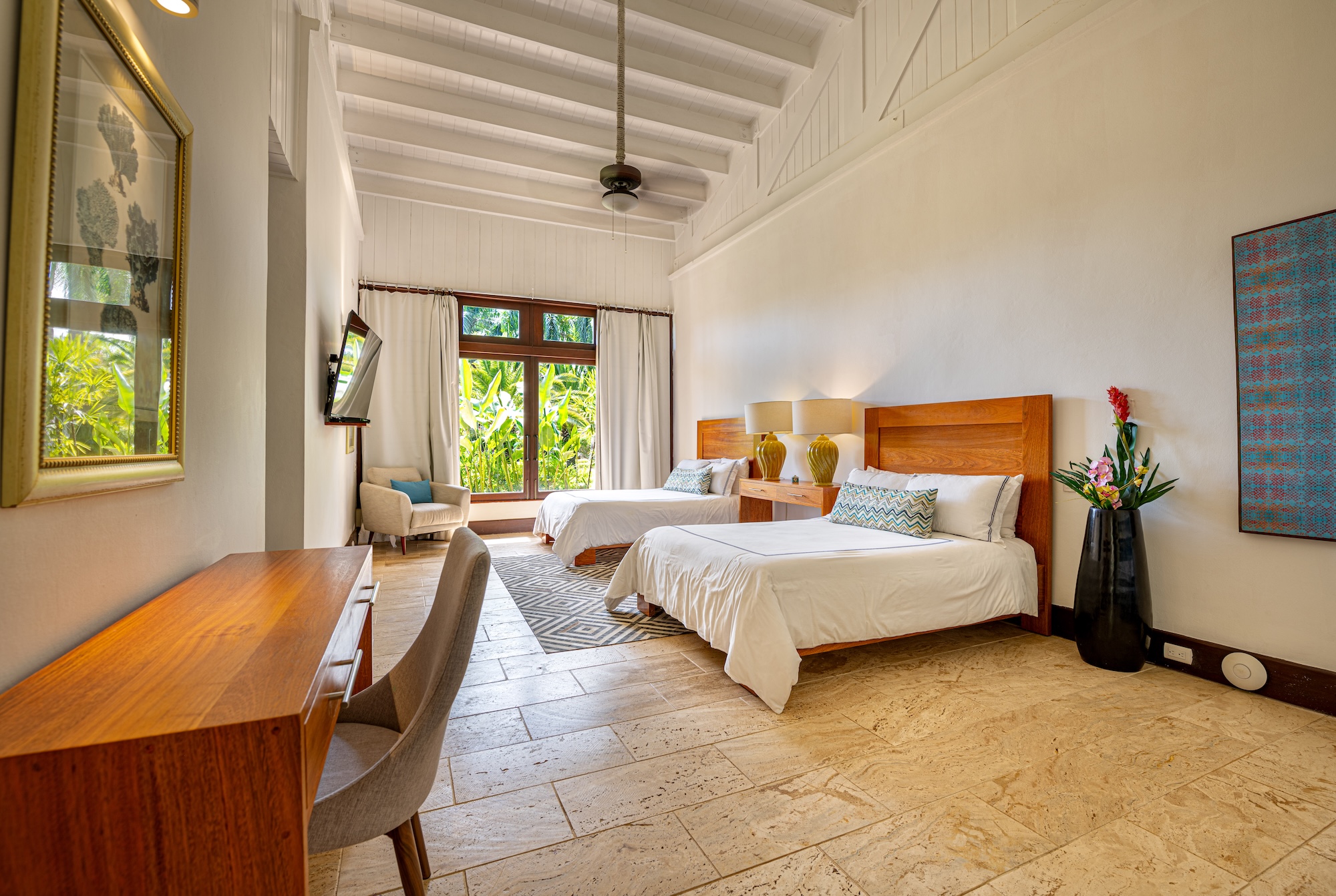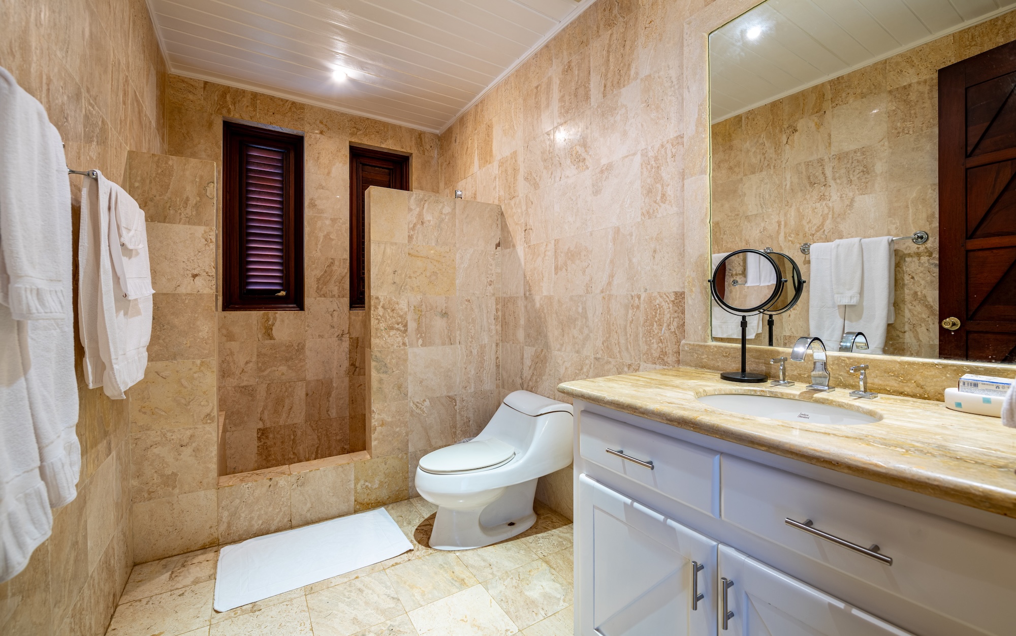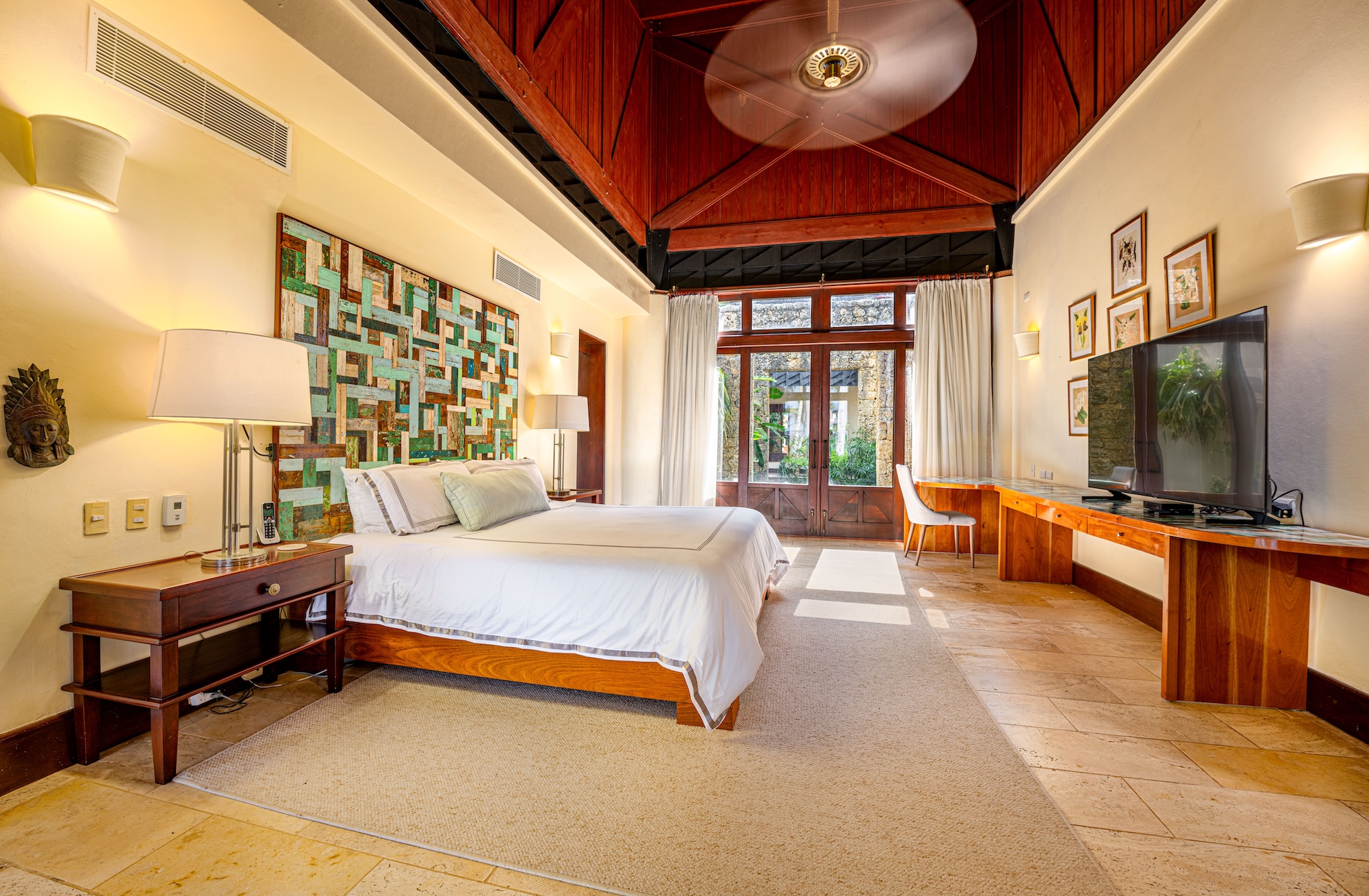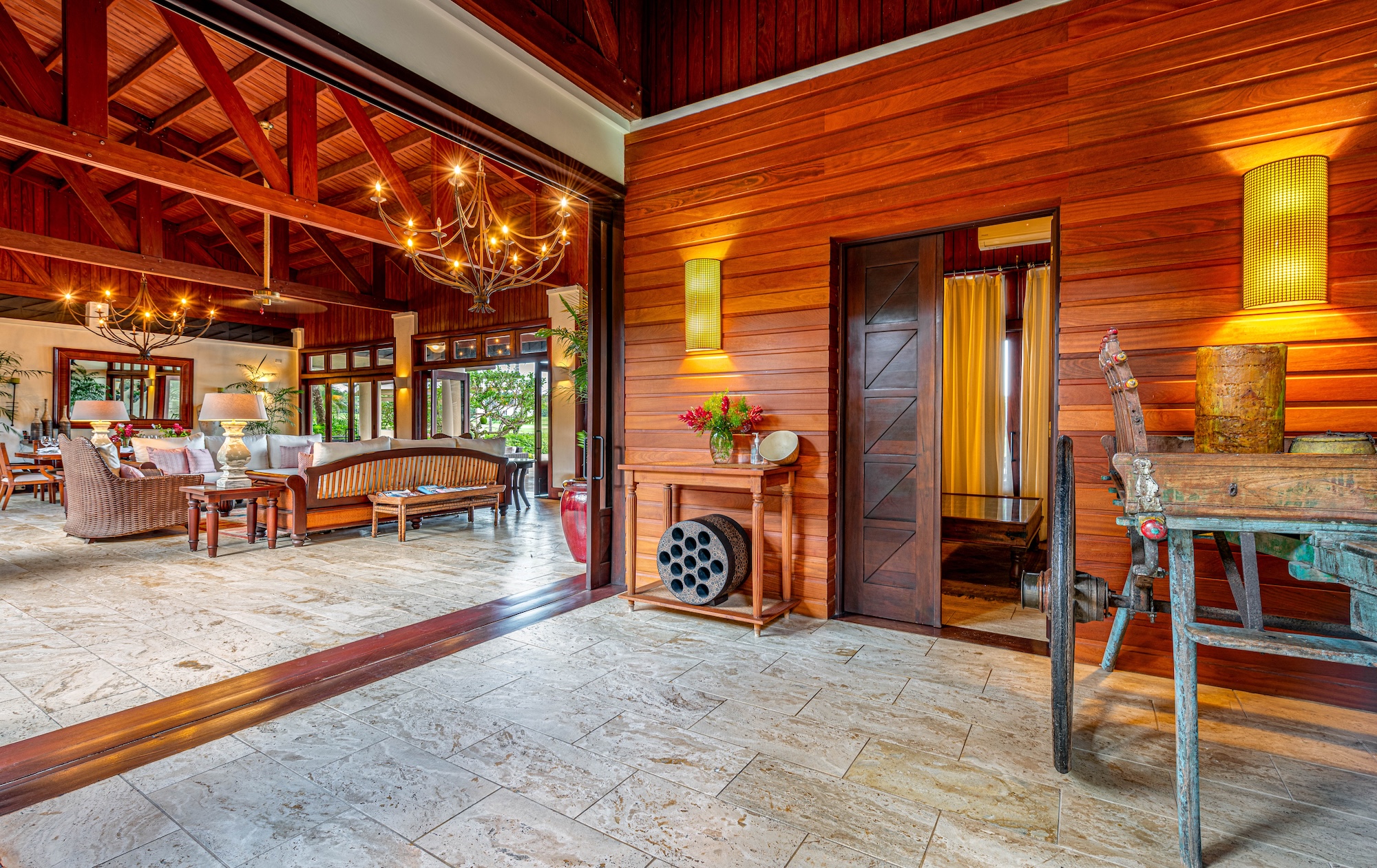 Three of the four bedrooms are situated along a gallery for added privacy, each with its own en suite bathroom. A cozy study/TV room includes a pull-out sofa bed for additional guests. The master suite, located on the opposite side of the house, enjoys gentle easterly breezes. Its spacious bathroom features separate his-and-hers areas and a private outdoor jacuzzi.