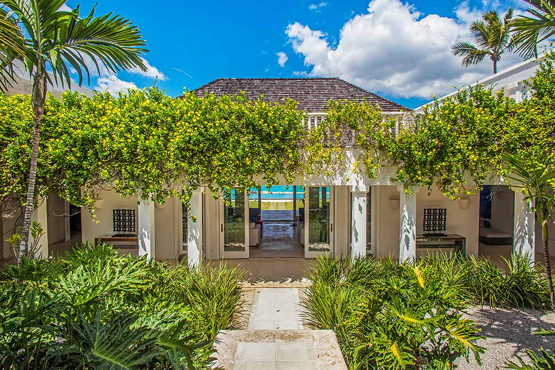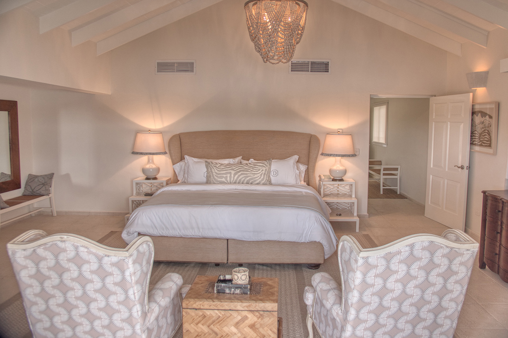 Among the eight bedrooms, two are luxurious master suites. One is situated on the top floor, offering magnificent views from private balconies. The second master suite is located on the ground level, ensuring easy access. The remaining six guest rooms are distributed between the top and ground floors. Each bedroom is equipped with an en-suite bathroom and a walk-in closet, ensuring comfort and convenience for all guests.