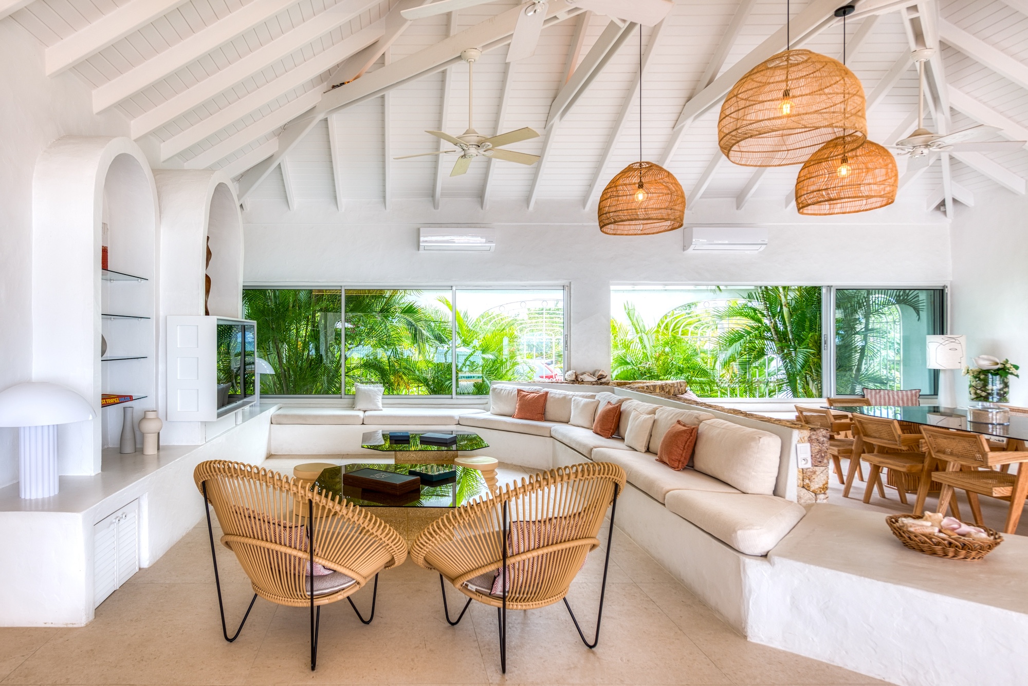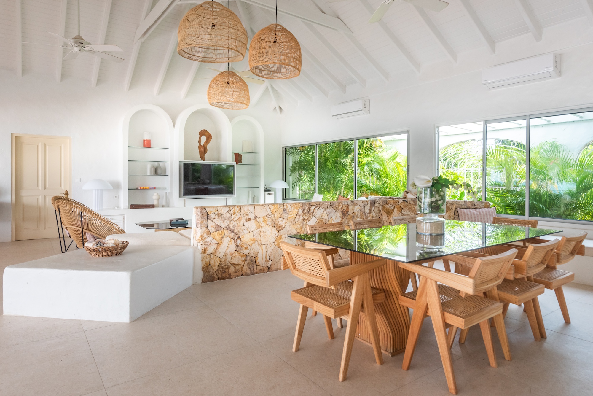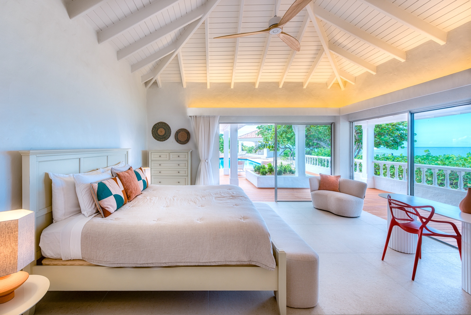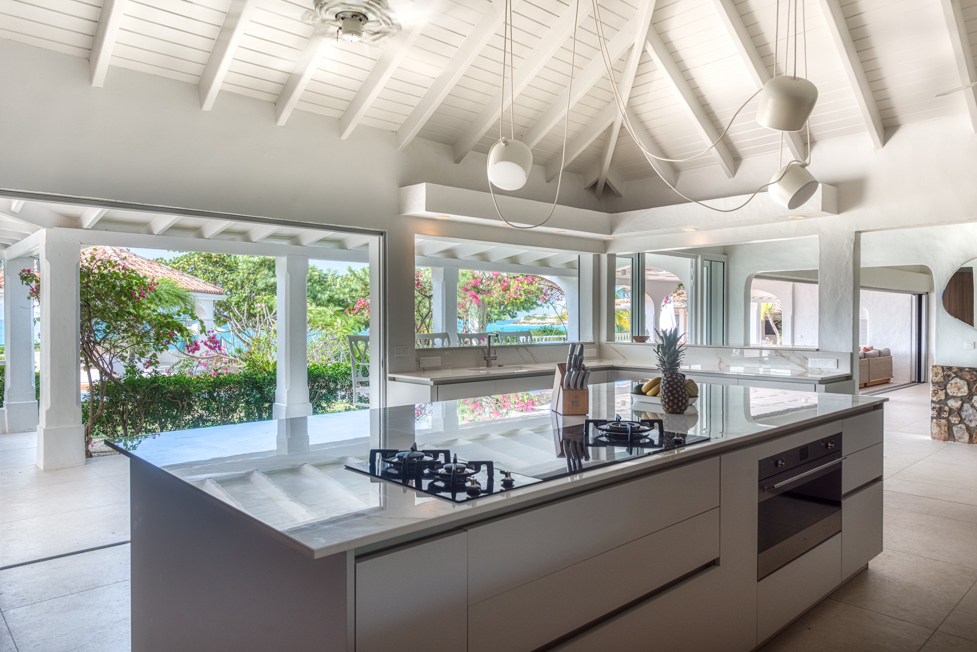 The expansive living and dining area, along with the well-appointed gourmet kitchen, seamlessly connect to the terrace, allowing you to bask in the mesmerizing ocean view. Each of the 6+ bedrooms in this Saint Martin villa rental features en-suite bathrooms and air-conditioning, opening onto the inviting pool terrace. Bedroom 2 even includes a cozy adjoining room suitable for a baby or small child. Flexibility abounds, as the villa can be rented as a 4, 5, or 6-bedroom retreat.
