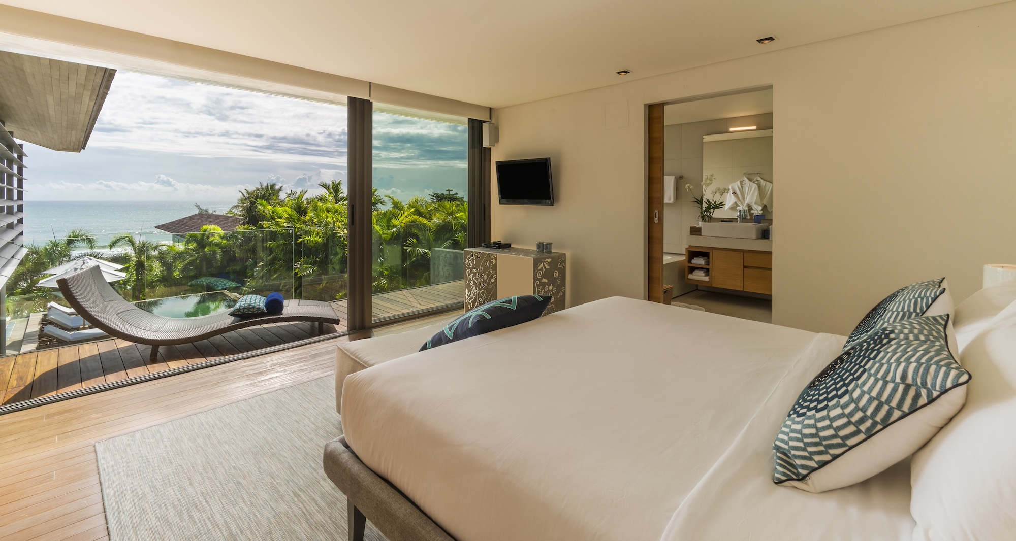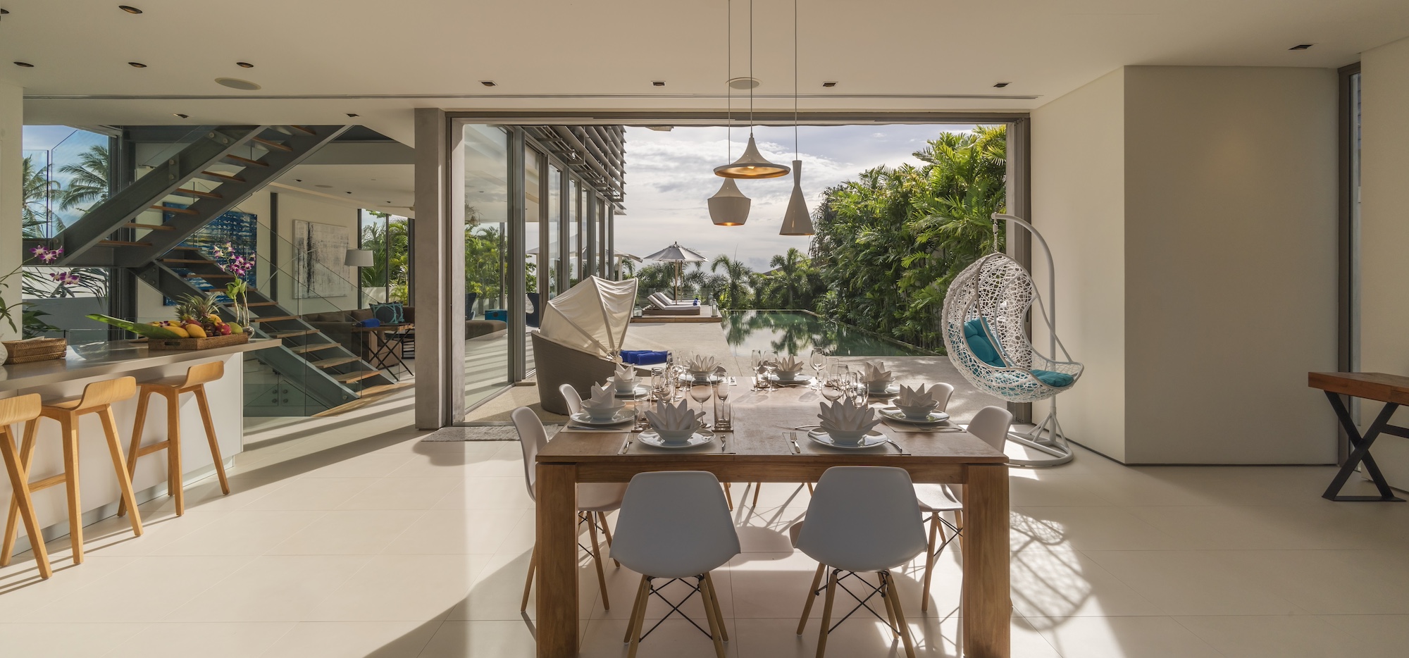 Sunlight spills onto the expansive terrace, seamlessly extending from the living and dining areas—an idyllic setting for shared meals and unforgettable moments. Outside, the stylish pool terrace invites you to unwind on plush sunbeds and loveseats beneath a breezy sala. The stunning 18-meter pool appears to merge with the horizon, offering a serene escape for a refreshing swim or a picturesque backdrop for alfresco dining. Designed for both relaxation and recreation, Villa Roxo features an array of leisure amenities, including table tennis, a foosball table, bicycles, and kayaks—perfect for both adventurous group retreats and laid-back family getaways.