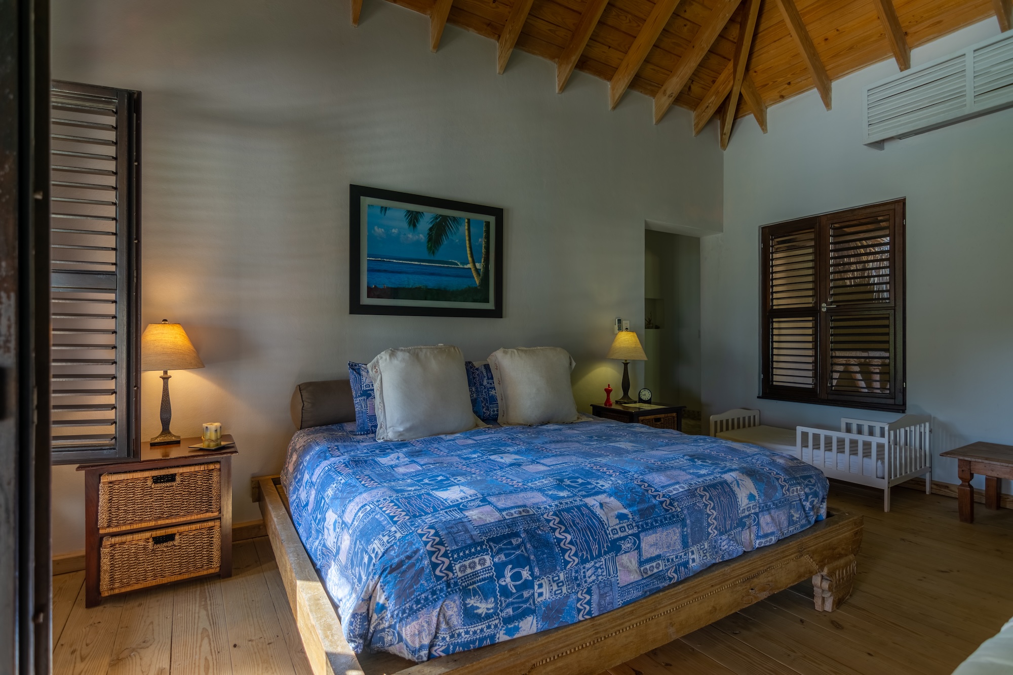 Expansive sliding doors connect the poolside terrace to the villa’s airy, open-plan interior, allowing natural light and fresh air to fill your mornings and evenings. Beneath soaring vaulted ceilings with exposed wooden beams, sip cocktails in the stylish lounge before gathering around the dining table for unforgettable feasts. The spacious, fully equipped kitchen provides everything needed for culinary delights and opens directly to an outdoor herb garden and barbecue grill. Throughout the villa, the décor and furnishings exude refined elegance, blending seamlessly with the island’s breathtaking natural surroundings.