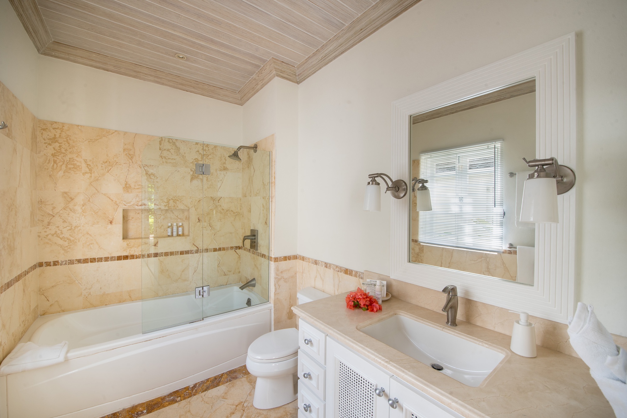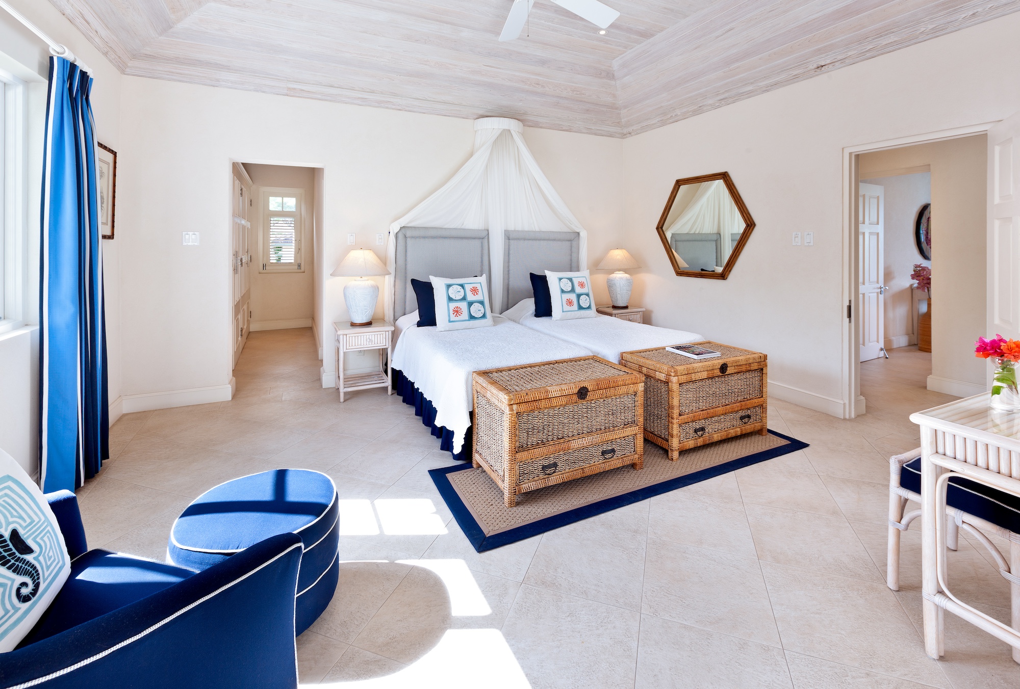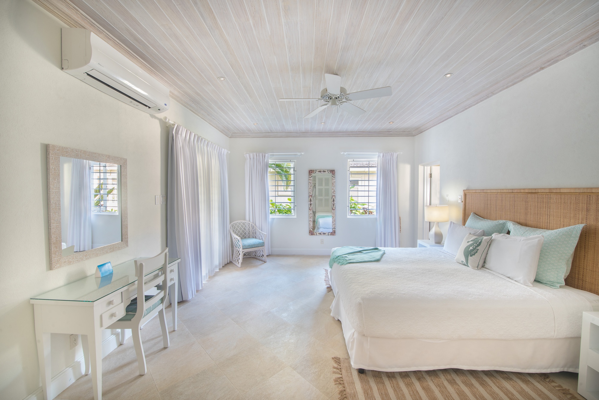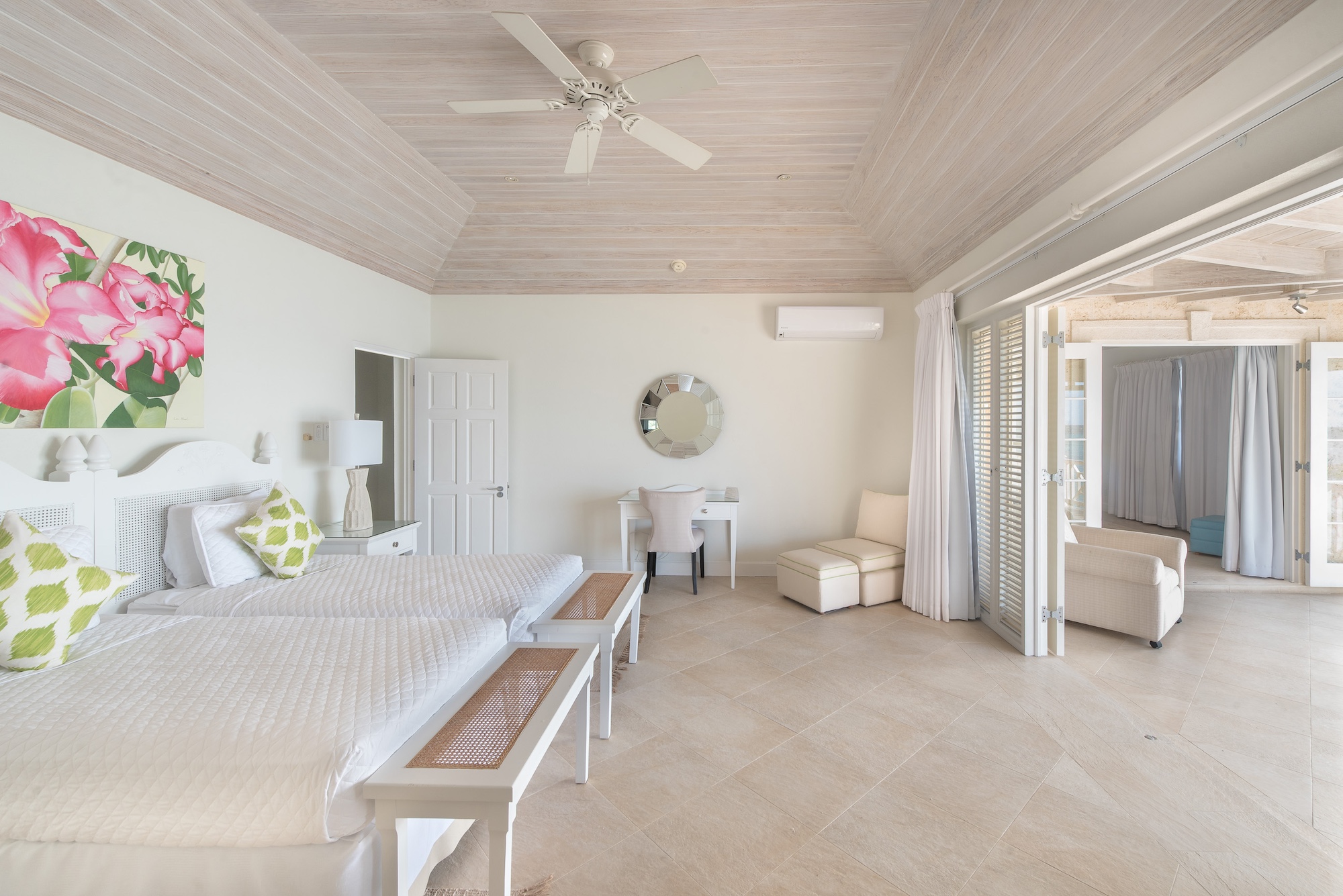 All bedrooms, equipped with outdoor patios, air conditioning, and en suite bathrooms, are situated on the first floor, except for one on the ground level. The master and second bedroom suite share a balcony with a magnificent view of Gibbes Bay, while the third and fourth bedrooms boast smaller balconies with charming garden views.