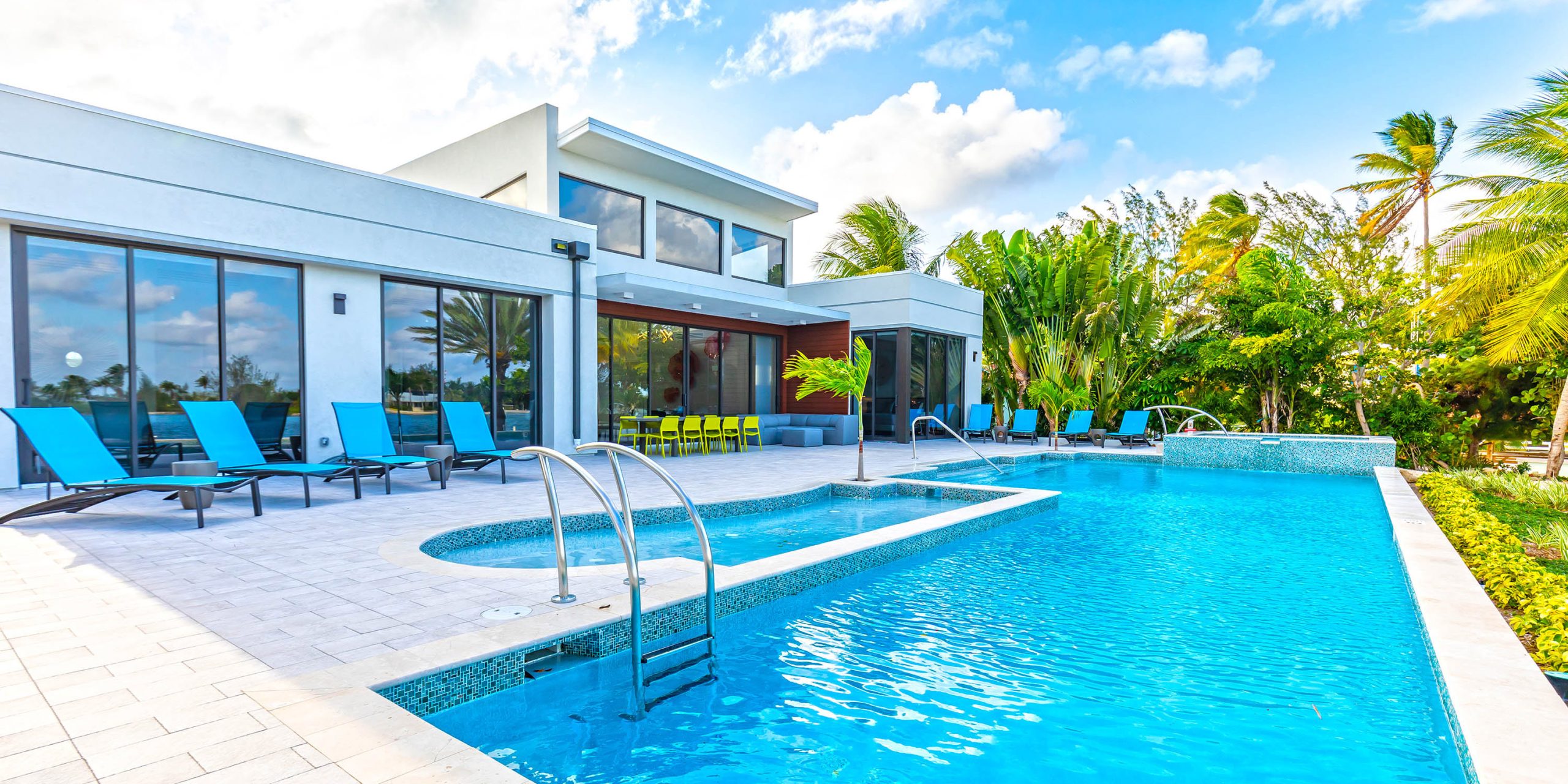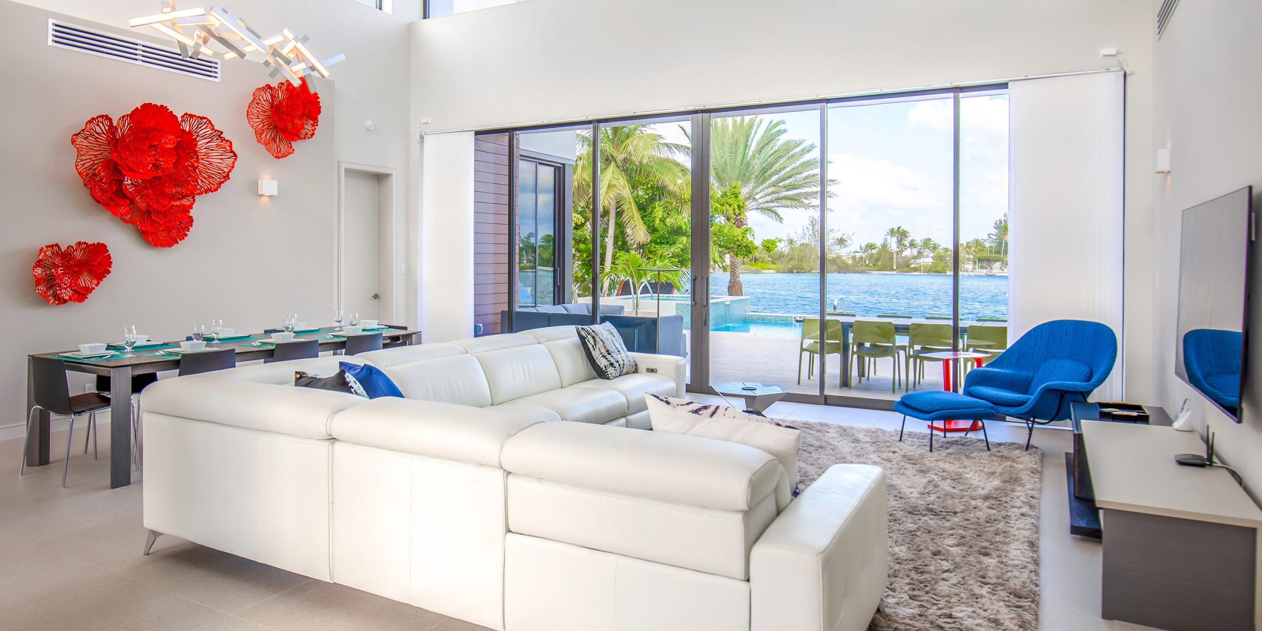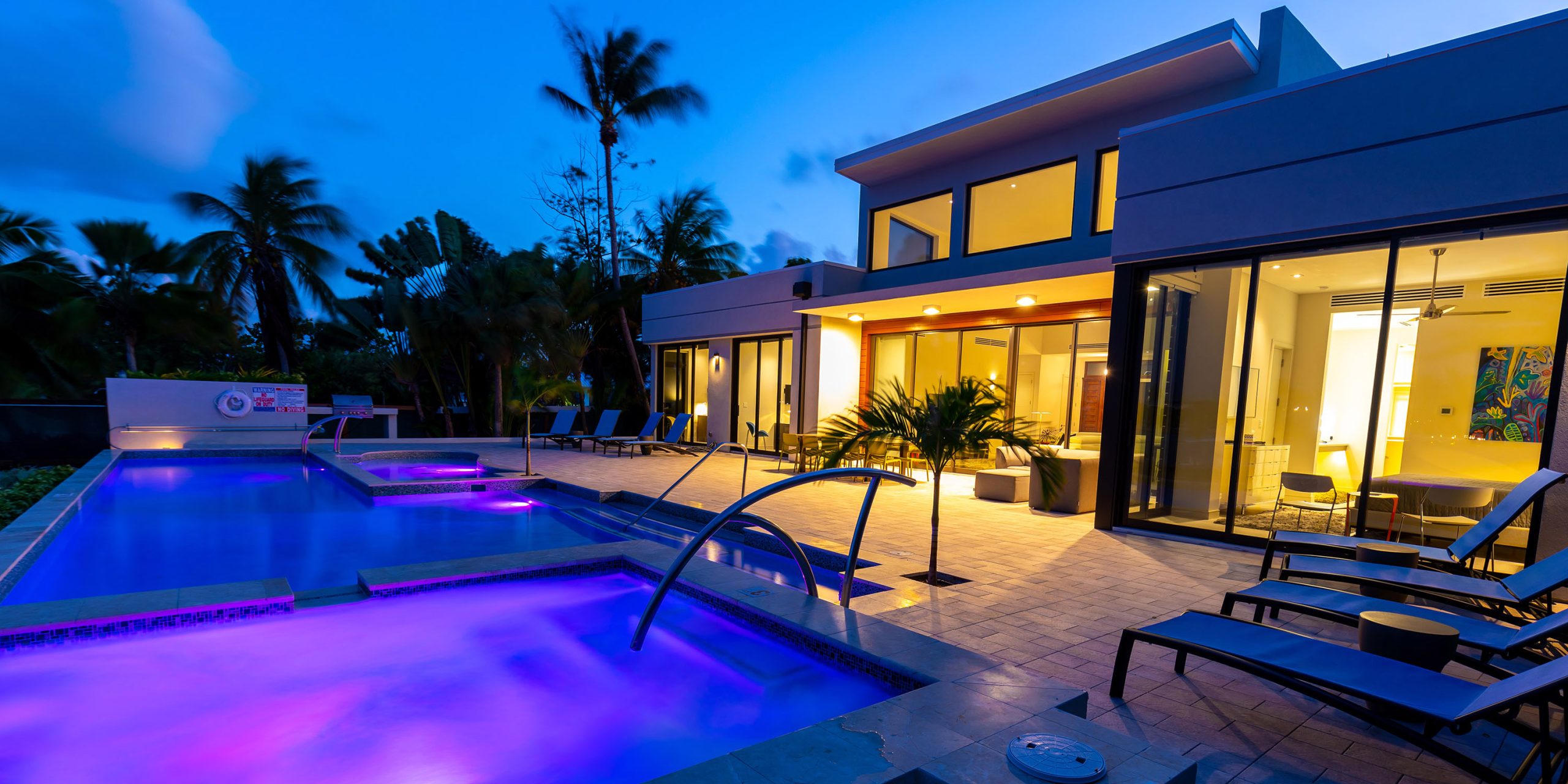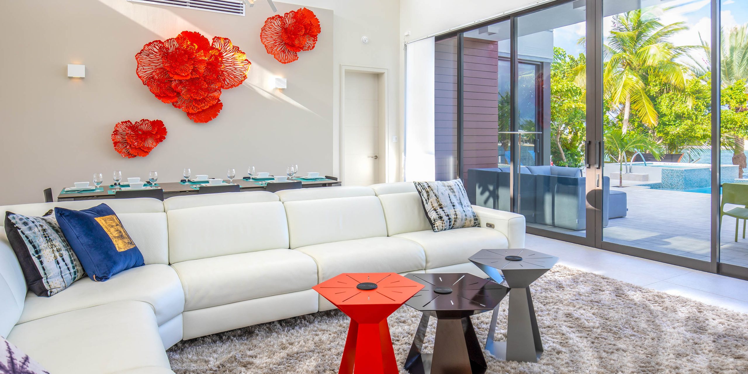 - Spacious great room with vaulted ceilings, direct access to the pool deck, outdoor dining space, and a serene cove behind the villa.