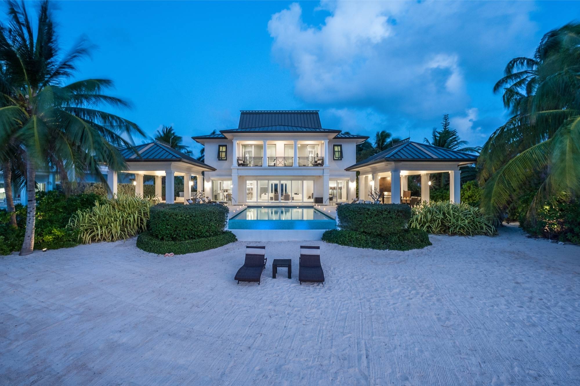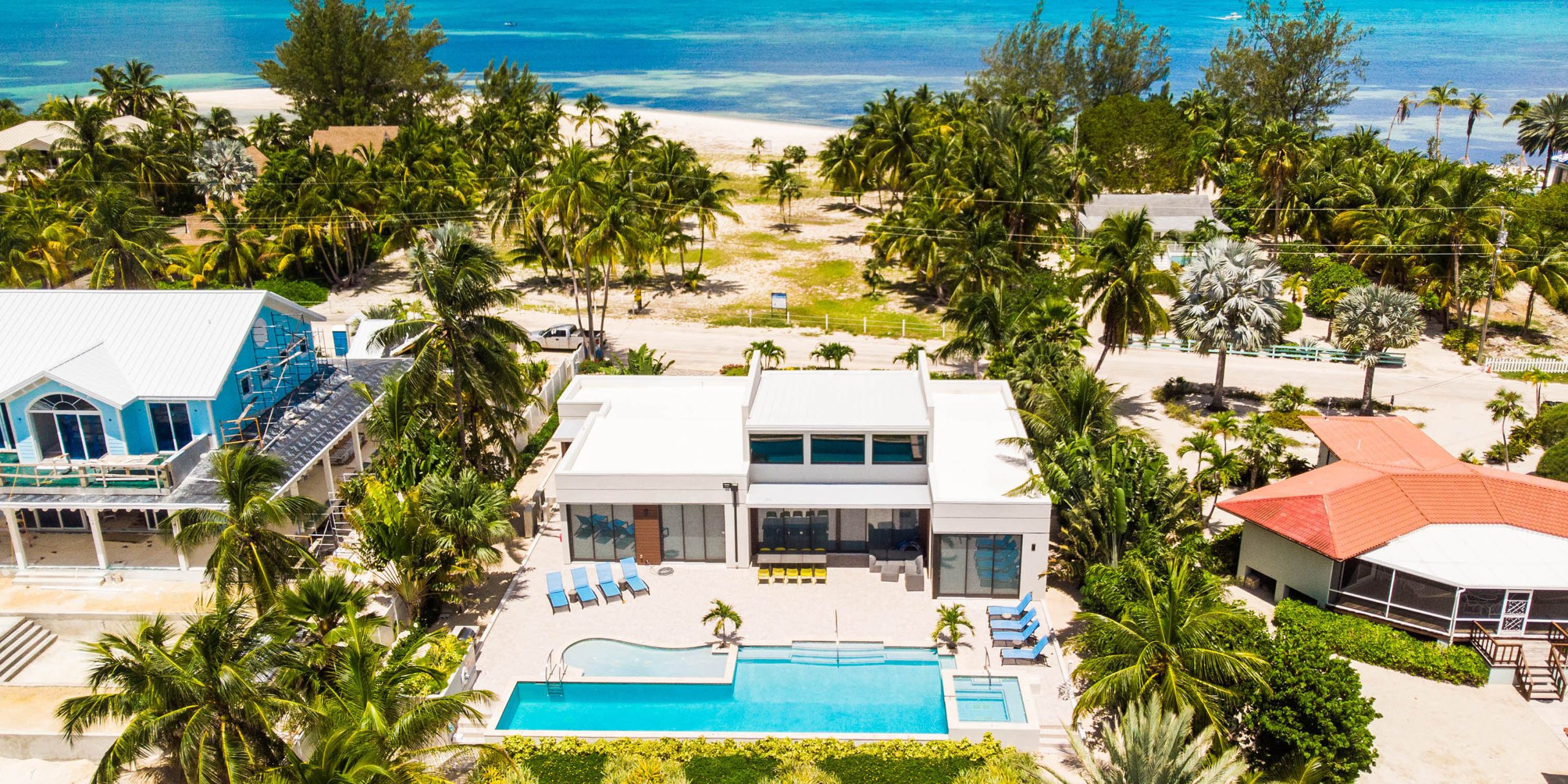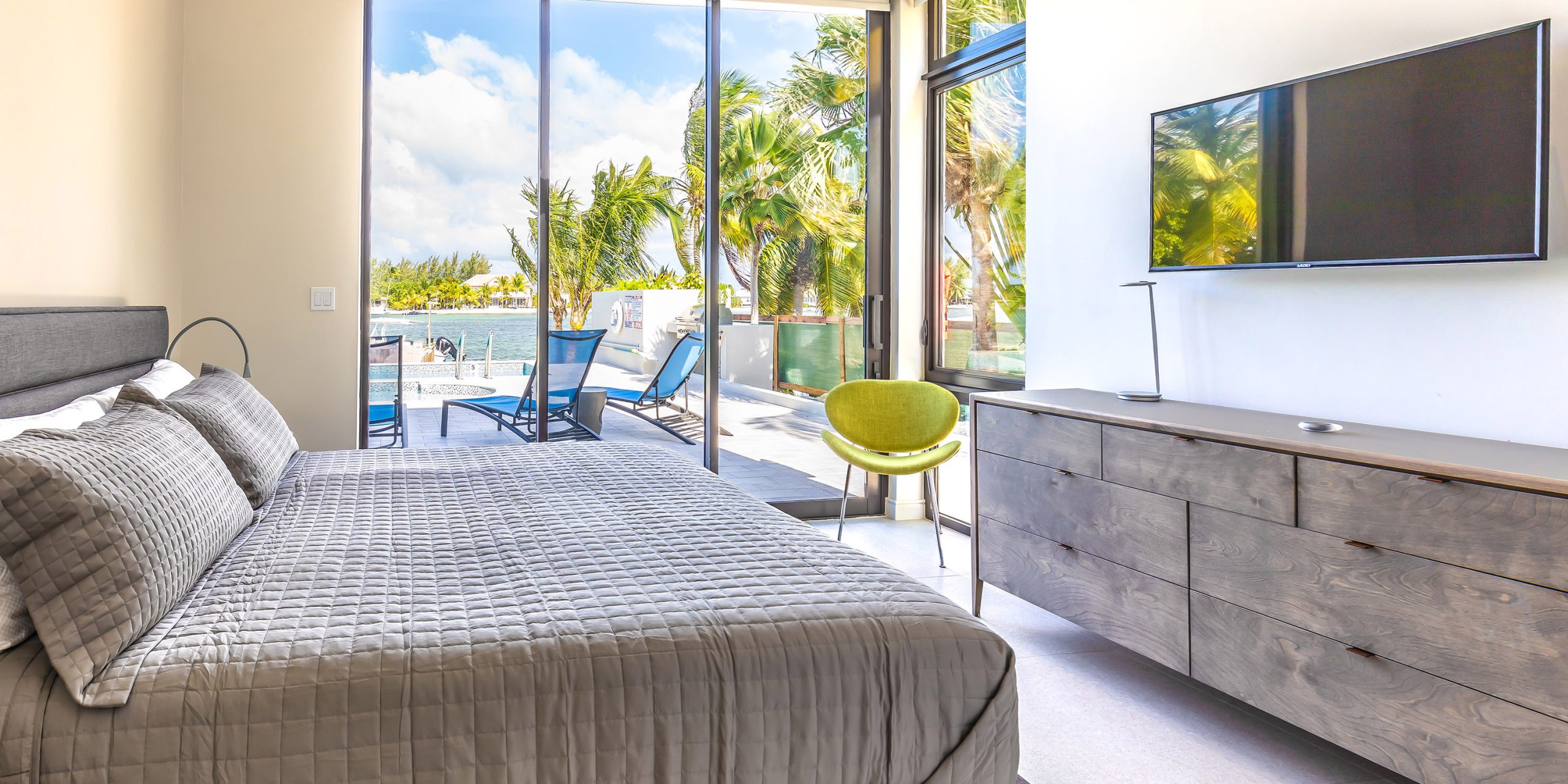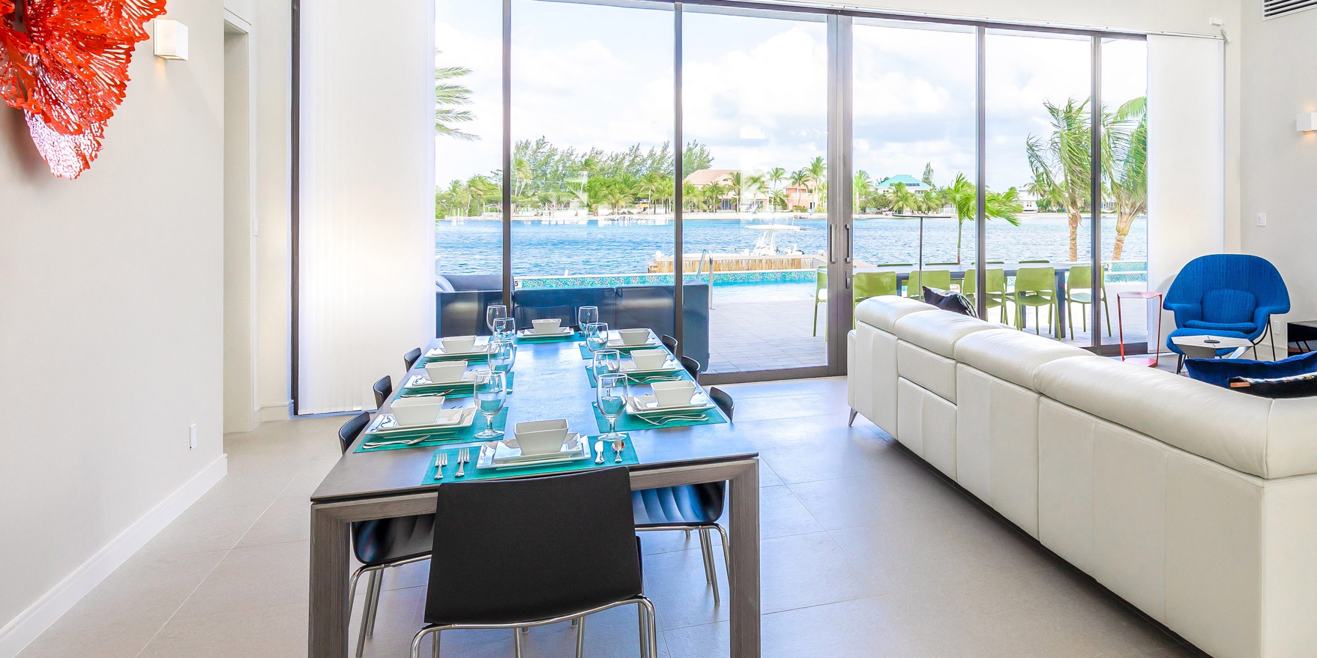 - Spacious great room with vaulted ceilings, direct access to the pool deck, outdoor dining space, and a serene cove behind the villa.