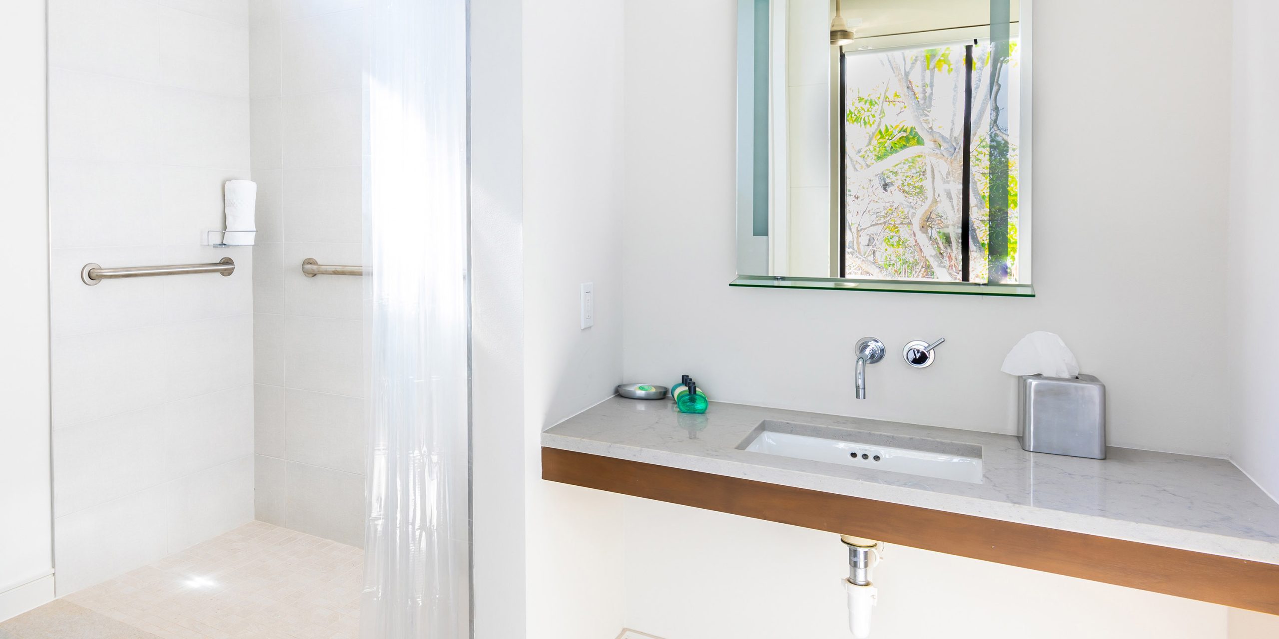 - Wheelchair-accessible ramp at the side entrance, with a handicap-friendly shower in the twin-bedroom suite.