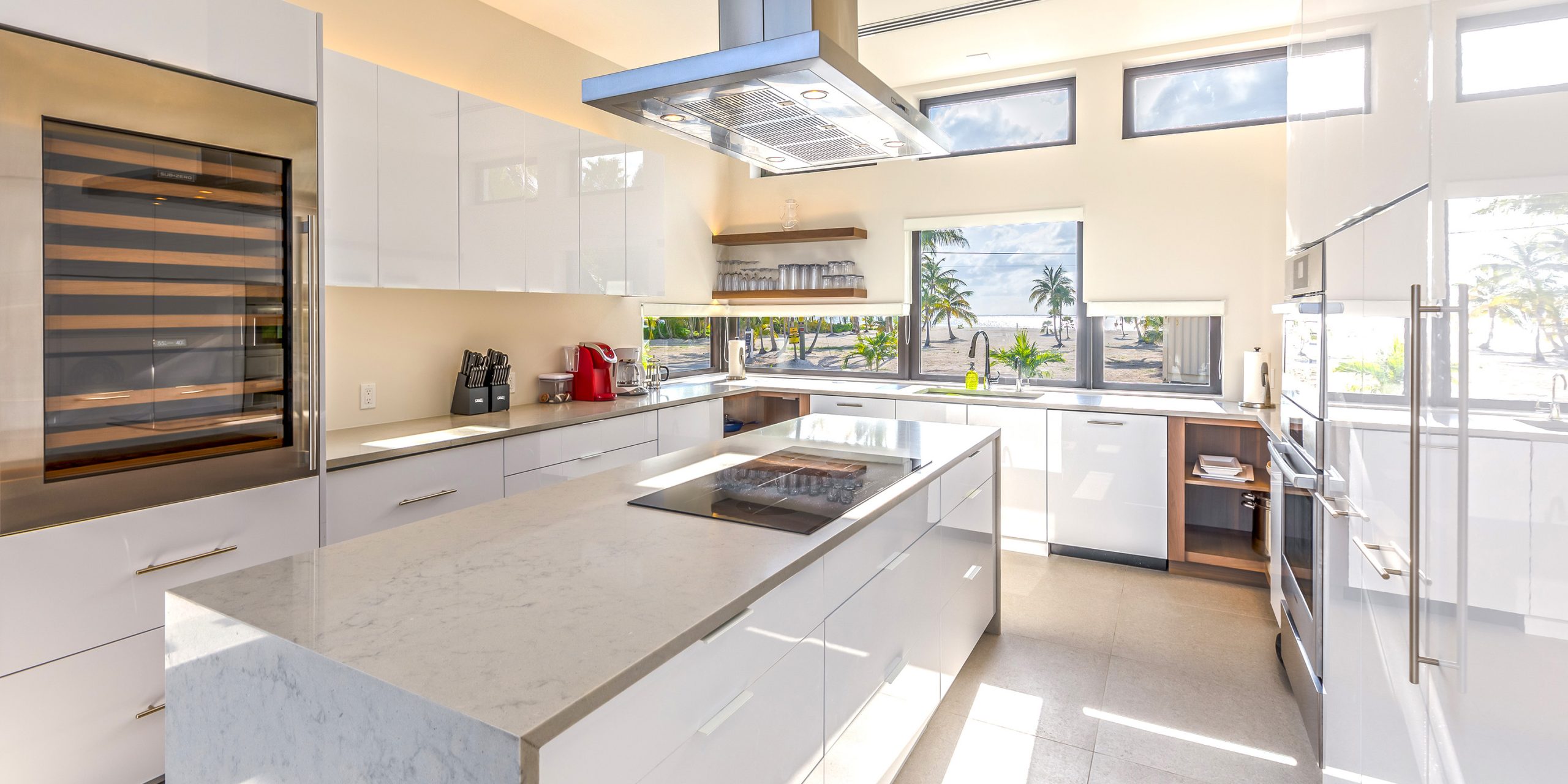 - Gourmet kitchen with an induction cooktop, Sub-Zero wine fridge, two dishwashers, extra Sub-Zero refrigerated drawers, and a freezer drawer with an ice maker.
